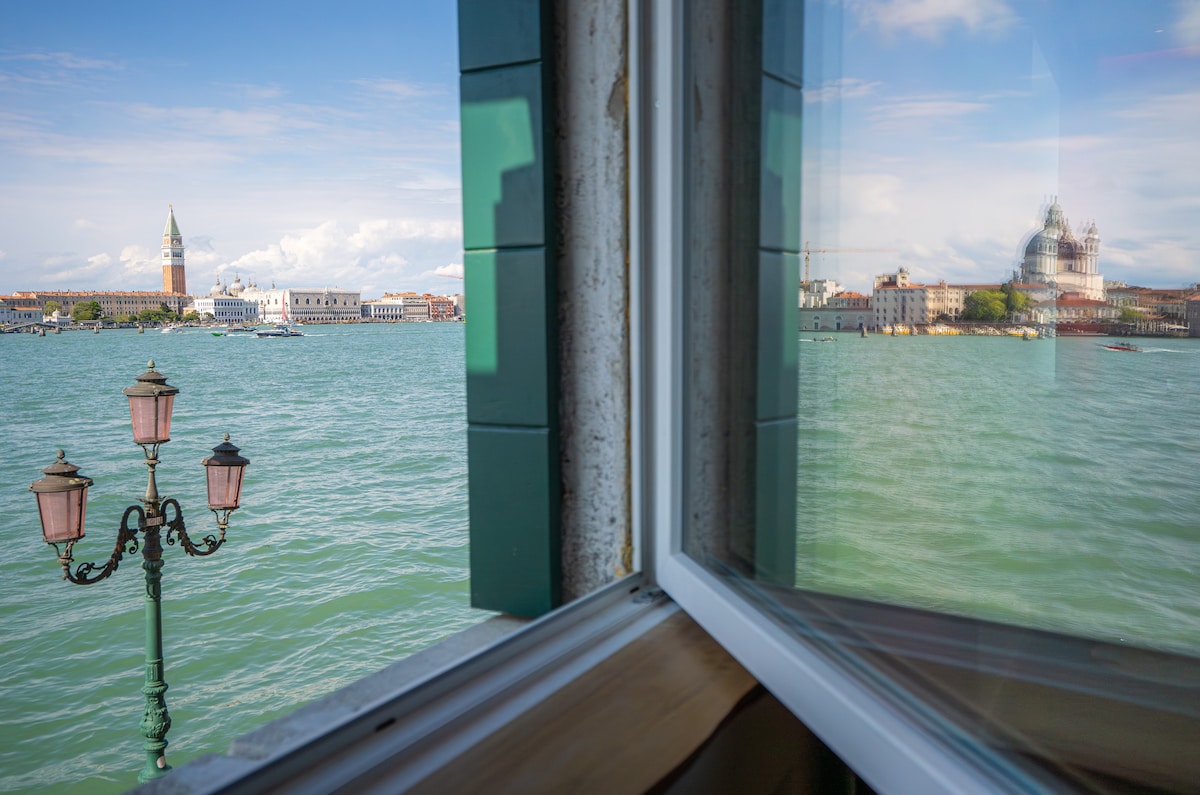Convenient 1st floor apartment completely renovated in 2024. View is unique, 3 windows facing the bell tower of San Marco, Palazzo Ducale, Salute Church and the whole panoramic basin of Giudecca canal. San Marco Square, the center of the city, can be reached in 1 stop (few minutes) while enjoying a boat ride. Giardini Biennale reachable in 3 stops (10minutes). A waterbus vaporetto / taxi stop is just 50 metres from apartment entrance , with plenty of lines every 15min H24 7/7.