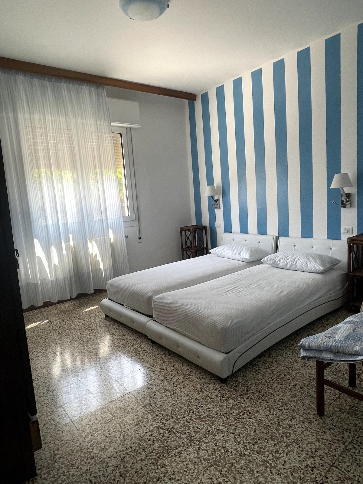 On the second floor (top) of a Villa of the early' 900 , 3 minutes walking from the Palazzo del Cinema, where The Biennale Movie Festival takes place, and 10 minutes from the pubblic beach. The independent space is divided into three rooms. One large room with king bed, wardrobe ,sofa and dining table. The equipped kitchenette and bathroom with shower. Bus at 2 minutes. In 10 minutes walking you reach the Terminal where boats leave to Venice.