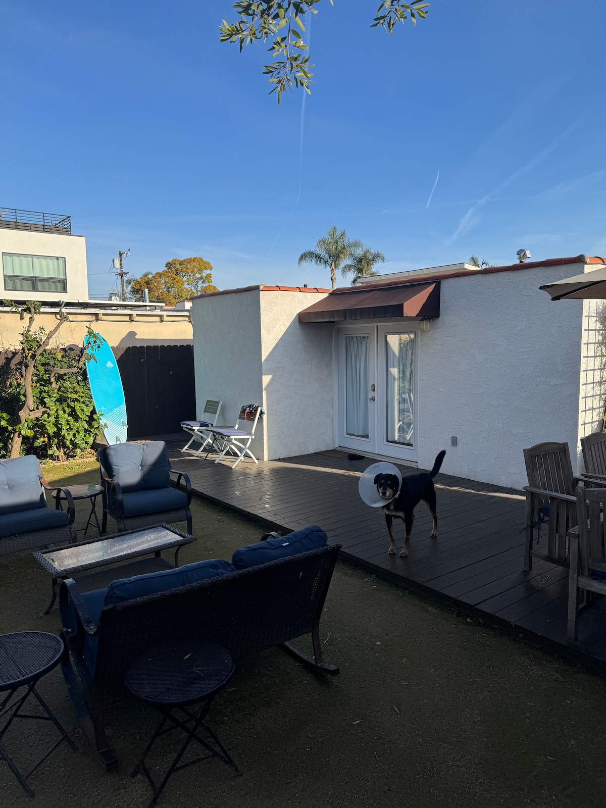 Escape to a stylish, secluded studio just minutes from Venice Beach! Newly remodeled, it features a comfy King bed, 85” Smart TV, dining/work table, and a well-stocked kitchenette. Enjoy true indoor/outdoor living with custom doors opening to a private patio with lounge seating, dining table, BBQ & fire pit. Tucked in a quiet Culver City neighborhood, yet close to Playa Vista & LAX. Relax & make yourself at home!