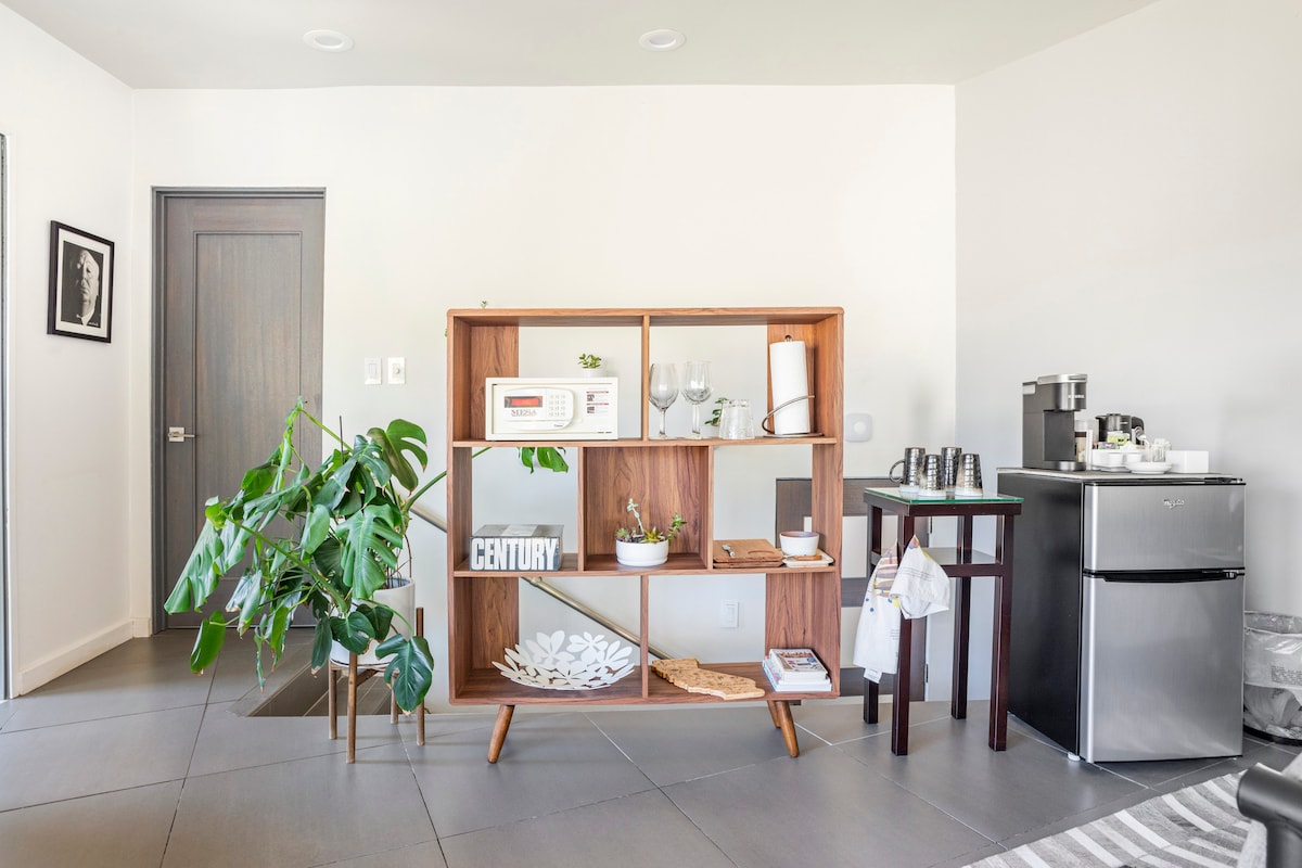 Enjoy this modern, light filled loft-style haven with high ceilings and expansive glass walls. Prepare meals in the beautiful kitchen with top-of-the-line appliances and kitchenware. Completed in 2017, this Bauhaus-inspired guesthouse was featured in GQ "Best Airbnbs in Los Angeles" list. Powered by solar panels, it offers a spacious open floor plan, private deck, and keyless entry. Rest assured, we're nearby to ensure your comfort. Experience modern luxury in this sun-drenched guesthouse.
