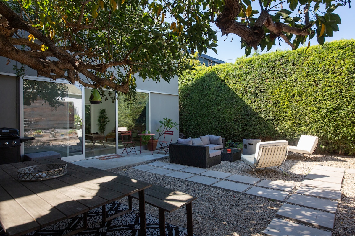 A zen & contemporary studio nestled around a 50-year+ old coral tree. This space embodies California indoor /outdoor living, with oversized custom doors that open to a beautiful outside space with a dining table, reading nook, BBQ & fire-pit. Full kitchen. Queen bed in small nook with barn doors for privacy & king bed in our low-ceiling upstairs loft area. Sofa bed & 70" TV in living room. The secluded studio is in a quiet neighborhood in Marina Del Rey, close to Venice Beach, Playa Vista & LAX.