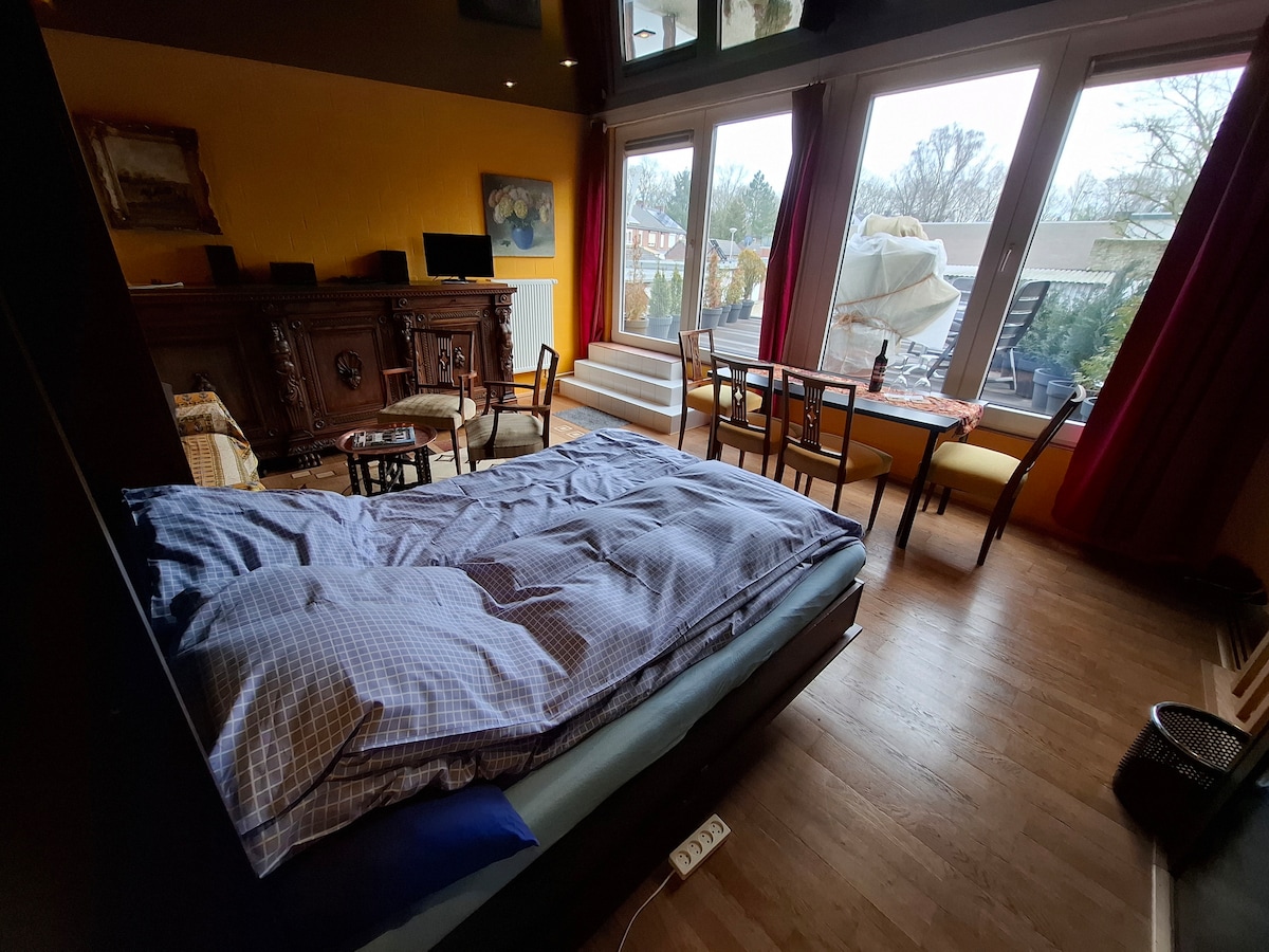 Fantastic studio apartment with private entrance and roof terrace - Free parking and bus stop in front of the building - 10 mins to the train station - 7 mins by car to the border - 40 mins to Eindhoven city center The studio has a private entrance. The ground floor comprises a bathroom, toilet, and kitchen. Upstairs, there is a large living/bedroom with a sofa bed, two chairs, a table, a wardrobe, a smart TV with Wi-Fi, and a roof terrace for smokers. Dogs are not allowed.