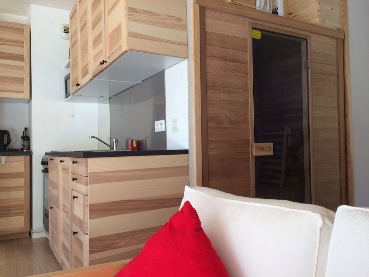 翻修一新的单间公寓,位于滑雪度假村中心,带有室内停车场