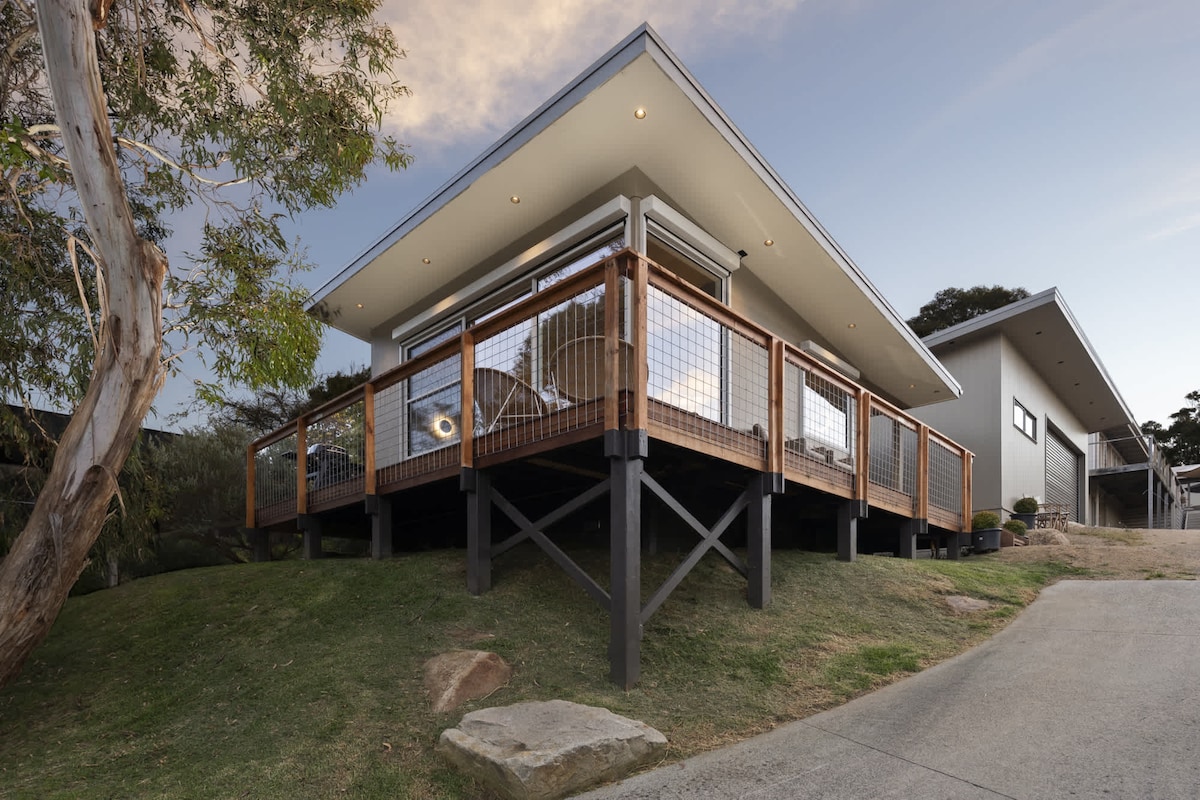 A house in a very special place! Between house and beach there's nothing but grass, bush, wallabys and rabbits. Enjoy the view from the roof deck or from level 1 - or whilst in the spa. Features everything new as of May, 2020 - beds, TVs, furniture, bedding, kitchen utensils. 2 large living areas each with huge TVs. The master bedroom also has a TV - along with a walk-in-robe, ensuite with spa bath, private balcony and its own 'retreat'. Pool table and log fire ensure you'd love it in winter.