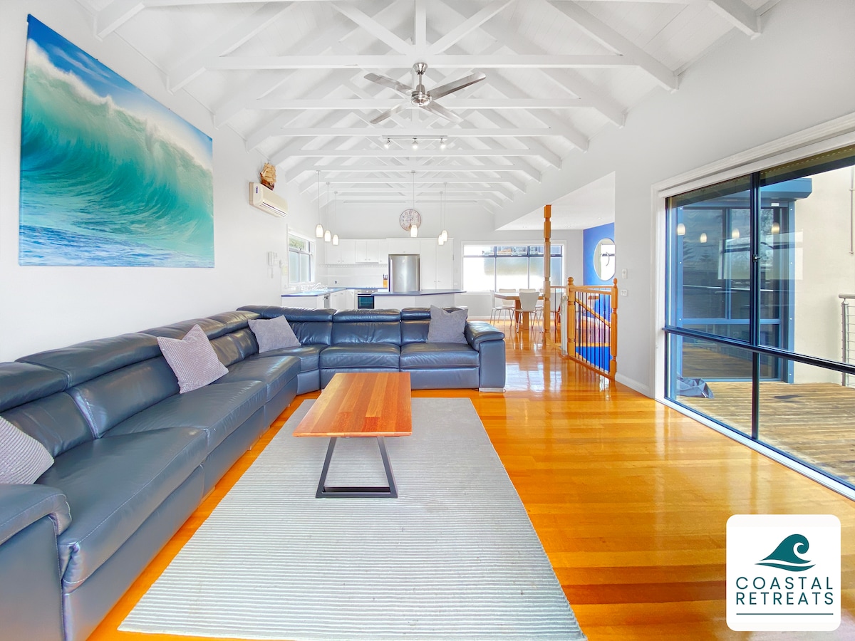 A house in a very special place! Between house and beach there's nothing but grass, bush, wallabys and rabbits. Enjoy the view from the roof deck or from level 1 - or whilst in the spa. Features everything new as of May, 2020 - beds, TVs, furniture, bedding, kitchen utensils. 2 large living areas each with huge TVs. The master bedroom also has a TV - along with a walk-in-robe, ensuite with spa bath, private balcony and its own 'retreat'. Pool table and log fire ensure you'd love it in winter.