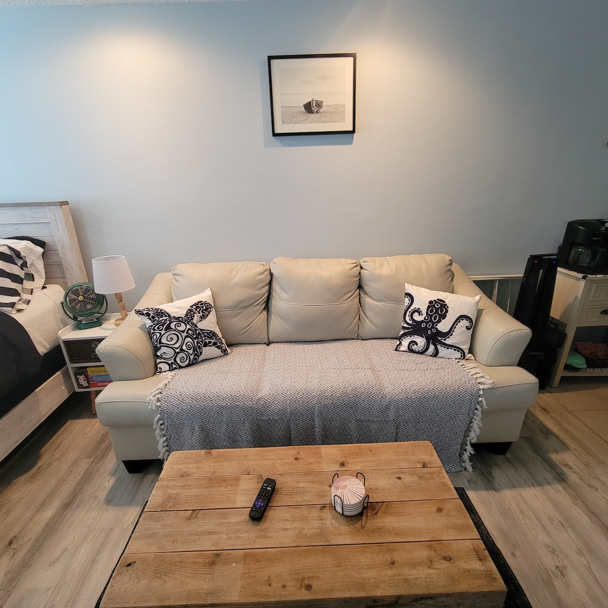 加热地板。时尚加大双人床。步行即可抵达木板步道
