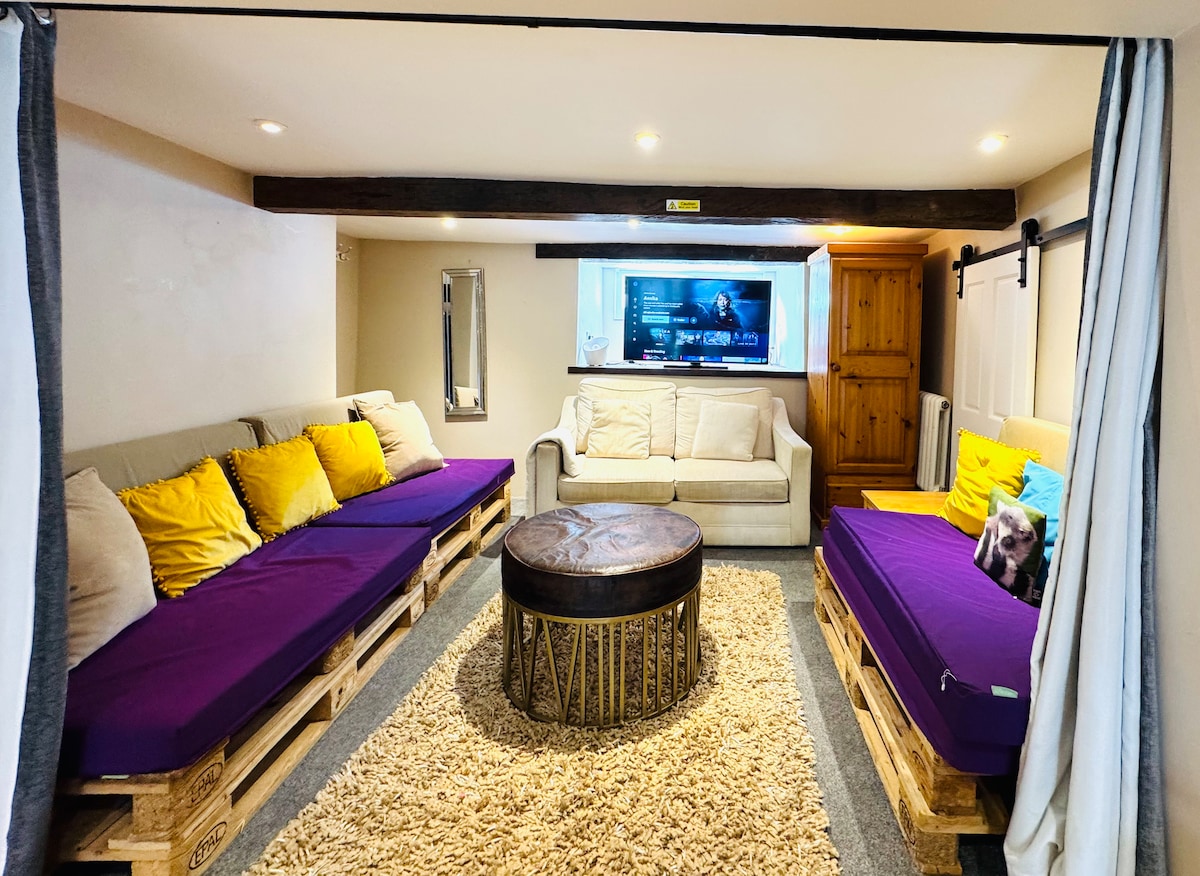 A beautifully converted chapel. Bright, spacious and lovely views from gallery, also a peaceful workspace. Wi-Fi. Pineapple Room with kingsize bed. Jungle Room twin beds or king. Lovely bathroom with shower over bath. Spacious family room with fully equipped kitchen, dining and lounge. Downstairs cloakroom. Designated onsite parking for one car. Enclosed garden ( access across car park). Two housetrained dogs welcome, MUST book. No puppies.