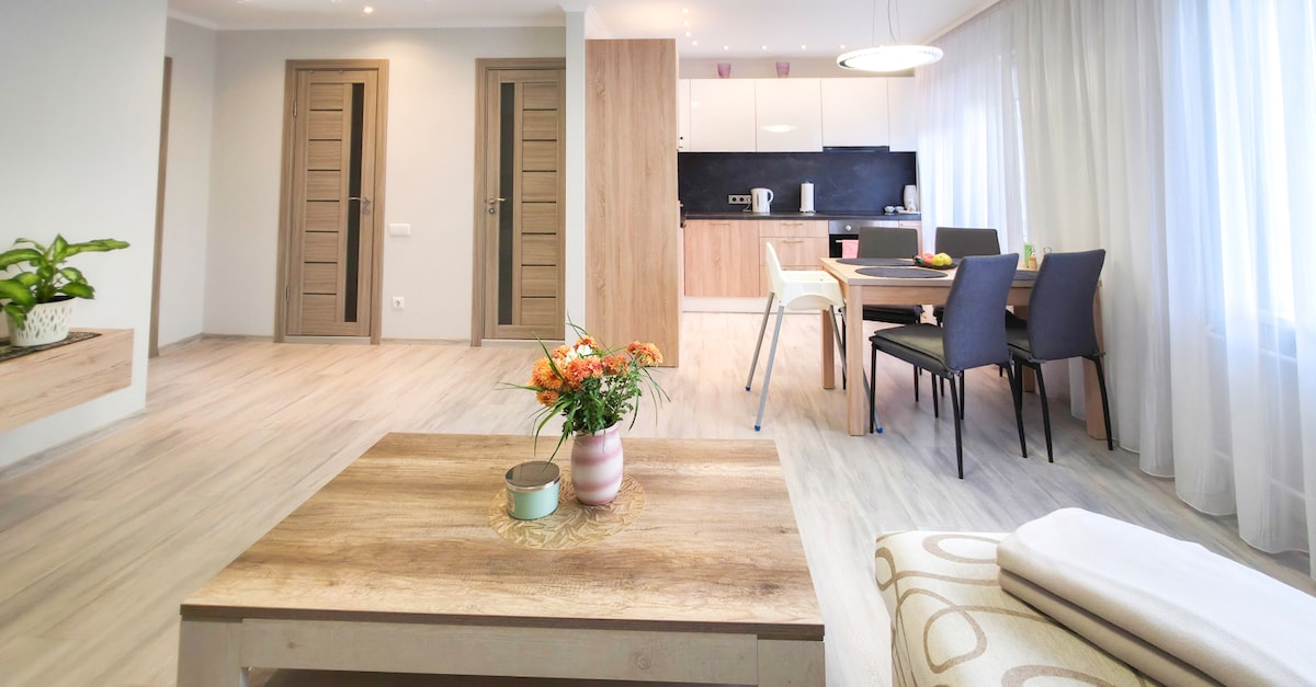 This family-friendly apartment with a city view has been fully renovated and stylishly furnished for your stay in Ventspils. It offers everything you need for a comfortable holiday: a fully equipped kitchen, bathroom with a bathtub, a cozy bedroom, and a studio-style living area to enjoy time together. Perfect location—just minutes from the Blue Flag beach and the Children's Town. Enjoy the beautiful city view and a relaxing getaway!