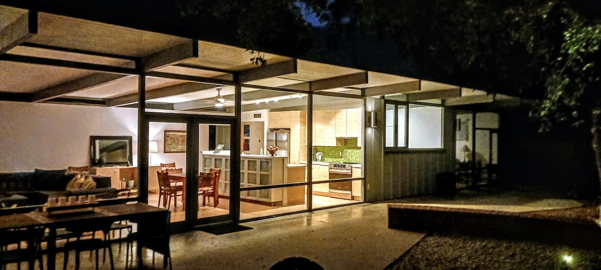 Rest and relax in our restored 1953 architectural gem with high ceilings and walls of glass opening to a private garden and patios under heritage oaks. Peaceful and serene, modern open kitchen, patio, birch floors and designer finishes. Relax under the oaks. Sleeps 4 Venture to nearby beaches from Ventura (20 min away) to Santa Barbara, discovery Old California in citrus and avocado groves of Heritage Valley and Ojai, explore historic Santa Paula. yet only aprx 1 hour from LA.