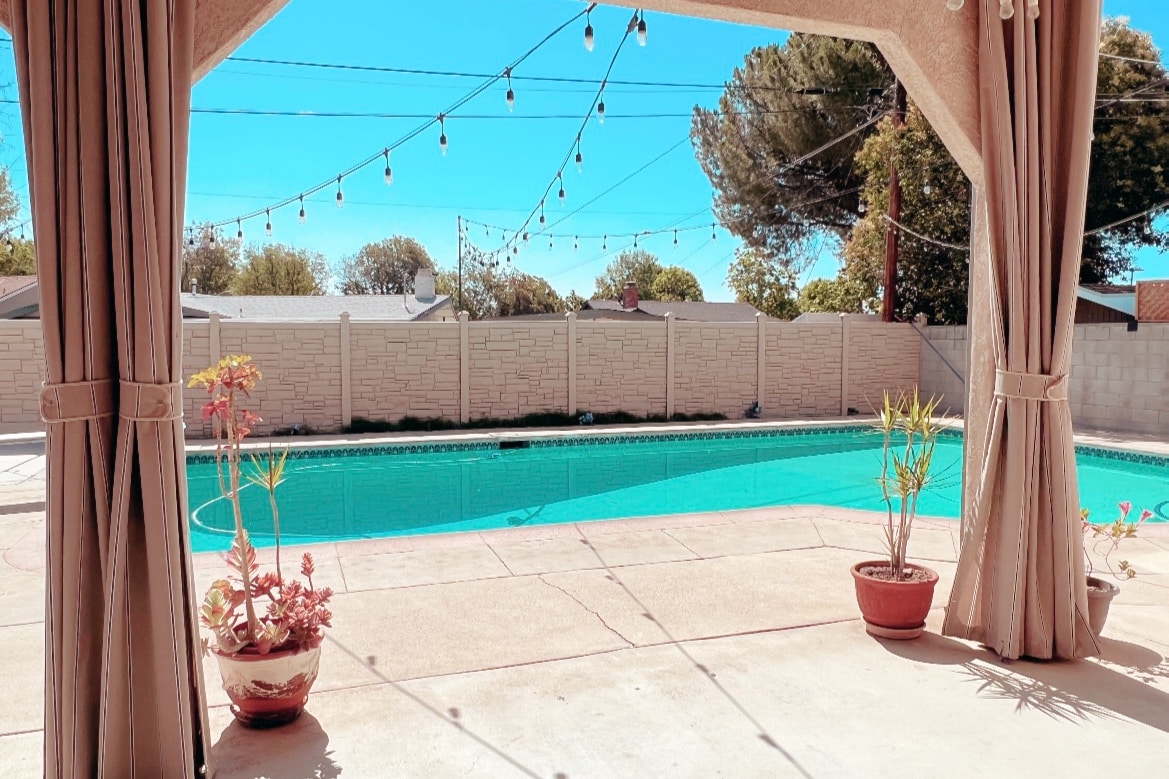 This stunning villa is located in Tarzana Hills. The villa has everything you need for a comfortable stay: pool, spa, private b-ball court, game room, patio & bbq area, outdoor dining, fully equipped kitchen, 4 bedrooms, comfortable living room w/ 82" tv, AC, washer & dryer. 4 bdrms, 2.5 bthrms, 2 parking spaces on driveway & 5 in front of home. The bedrooms feature CA king sz bed, 3 bedrooms w/a queen sz bed, ea bed can sleep 2 guests. Central AC for entire home & ea bdrm has his own AC unit.