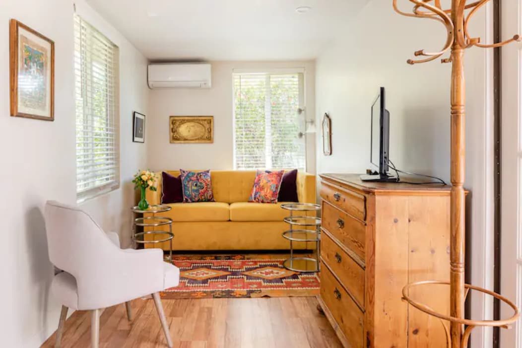 The cottage is located by our orchard, very private w views from every window. Comfortably furnished (Queen bed, couch, desk, armoire, dresser,TV) it comes w a kitchen (incl w/d), bathroom (shower) and a fenced yard to relax. It has a light and airy feel, heating and a/c. Comfortable to get to work or heal or explore SoCal's beaches, mountains, hiking, biking, visit Universal Studios or Santa Barbara a perfect little home to get away for a couple of days, weeks or even months.