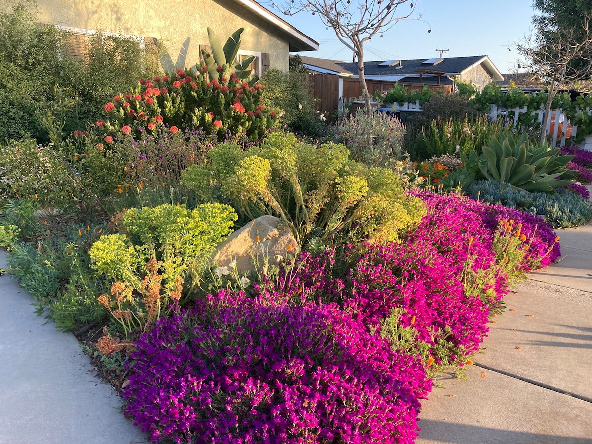 This small, cozy cottage has been renovated and also has a hot tub, doggie wash & outdoor kitchen. Stylish décor provides a comfortable tranquil haven & perfect place to unwind in the hills of SoCal yet the neighborhood is rural-like. It is ideal for activities such as hiking and cycling, with trailhead just down the street. The stunning coastline is only about a 30-minute car ride away and many other attractions are within an hour. Relax on the breezeway, porch, or by the open fire pit. 🐝