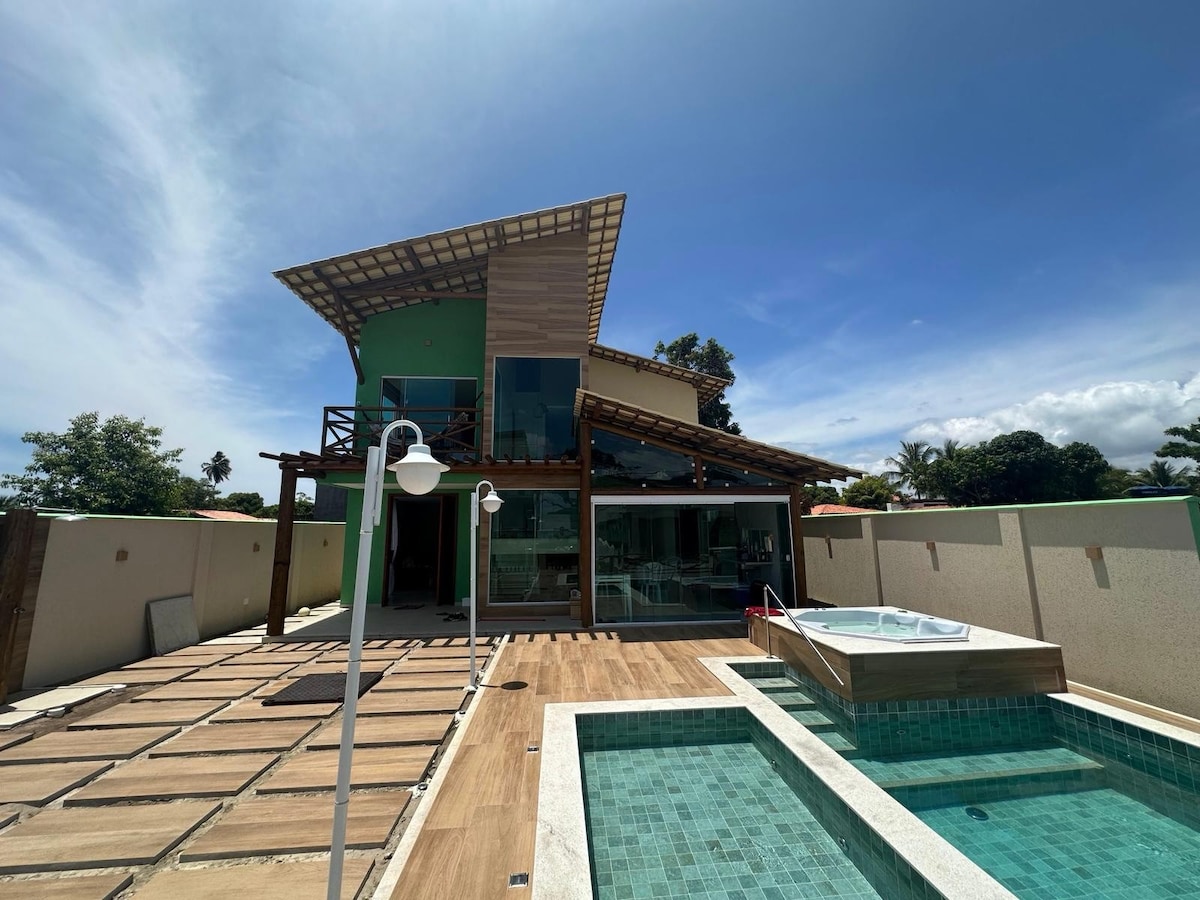 Leve toda a família a este ótimo lugar com muito espaço para se divertir, Condomínio fechado com área de lazer, casa ampla com piscina, churrasqueira e jacuzzi, a 200 metros da praia