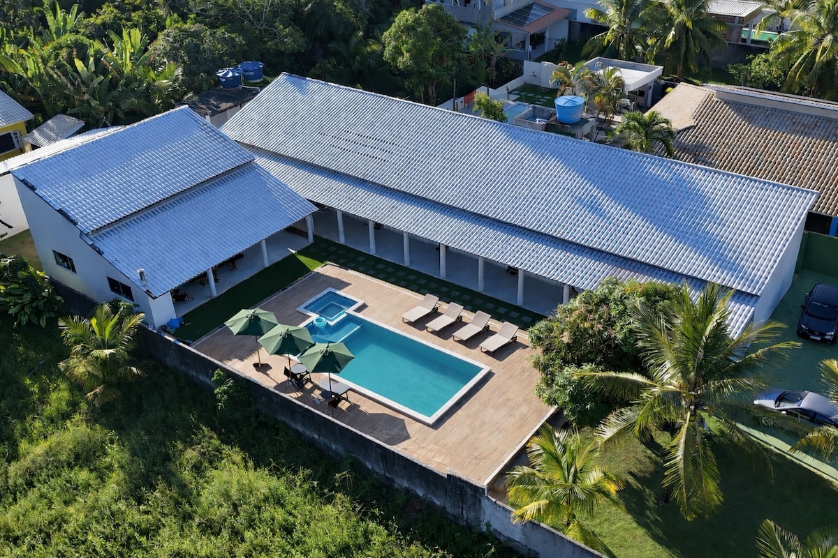 Casa ampla no Condomínio Praia de Paratinga, Ilha de Itaparica, com 7 suítes todas com ar-condicionado, piscina privativa, área gourmet, cozinha completa e Wi-Fi. Acomoda até 20 hóspedes. Ideal para famílias e grupos. Inclui água, internet e manutenção da piscina. ⚠️ Energia cobrada à parte conforme consumo (R$ 1,45/kWh), com leitura no check-in e check-out. Fica a menos de 50 metros do mar, praia privativa do próprio condomínio, com barraca de praia (Point das Amendoeiras).