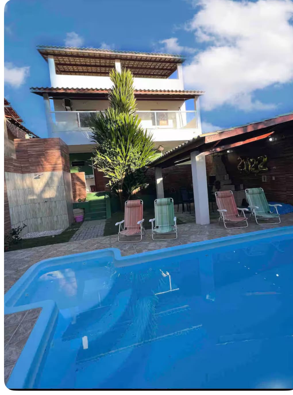 Nossa casa é bem aconchegante, a um minuto da praia, em um local com área total de 700 mt2, de área verde, ideal para você e sua família descansarem e se divertirem, possui 3 quartos, duas Suites, mais dois banheiros, e um quarto externo com 1 cama Casal e outra de solteiro, todos com Ar, piscina de 9x6 metros, com Deck, e demais acessórios. Também temos à disposição cadeiras de praia, sombreiros, churrasqueiras, balcão americano, mesa em área gourmet com acesso a piscina. 12 Pessoas