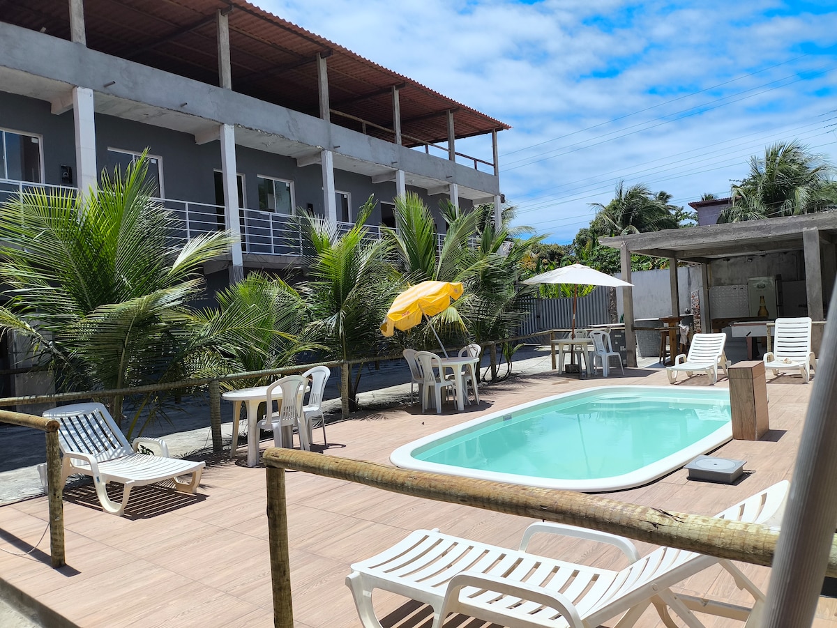 Nossa casa é bem aconchegante, a um minuto da praia, em um local com área total de 700 mt2, de área verde, ideal para você e sua família descansarem e se divertirem, possui 3 quartos, duas Suites, mais dois banheiros, e um quarto externo com 1 cama Casal e outra de solteiro, todos com Ar, piscina de 9x6 metros, com Deck, e demais acessórios. Também temos à disposição cadeiras de praia, sombreiros, churrasqueiras, balcão americano, mesa em área gourmet com acesso a piscina. 12 Pessoas