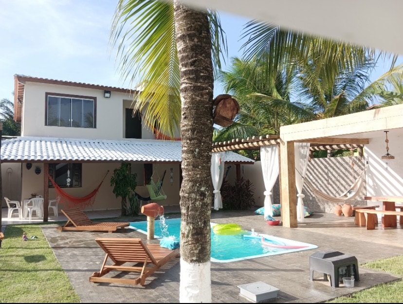 Casa em terreno murado de 700m2 para suas Crianças e Pets, a 120m da praia, No Condomínio Recanto das Pérolas do lado do mar. Circule em paz e segurança. Temos Wi-Fi, 4 quartos (todos com ventiladores de teto e roupa de cama), 3 banheiros e um chuveirão para volta da praia. Quiosque com uma mesa: reuna a família ao ar livre para jantar e jogar, nesse espaço equipado com Pia, Forno a Lenha e Churasqueira que faz um belo par com o Freezer Horizontal da cozinha. Seja Bem Vindo!