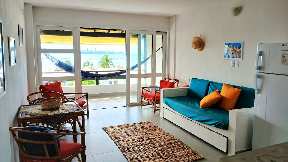 Venha relaxar neste flat calmo e cheio de estilo à beira-mar, em Mar Grande, na Ilha de Itaparica. Apartamento privativo, com um quarto (suíte), dois banheiros, cozinha americana e varanda privativa espaçosa para curtir a vista para a Baía de Todos os Santos, tendo no horizonte, Salvador. Localizado em condomínio fechado em frente à praia, com portaria 24h, serviço de camareira e estacionamento. "Ah, Quem me Dera!" é um flat cuidadosamente decorado para trazer aconchego e paz!