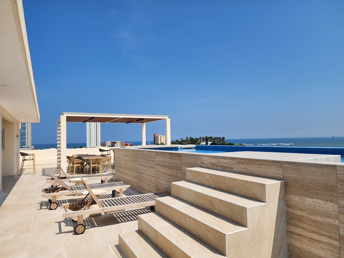 Ubicado en pequeño edificio de dos departamentos sin elevador. El departamento se encuentra en 3er y 4to piso. La terraza cuenta con camastros y juego de jardín con sombrilla. La cocina cuenta con refrigerador, congelador y dos parrillas de induccón. Todos los espacios cuentan con aire acondicionado, ventiladores y mosquiteros. El jacuzzi cuenta con calentador de agüa. Garage para 2 autos.