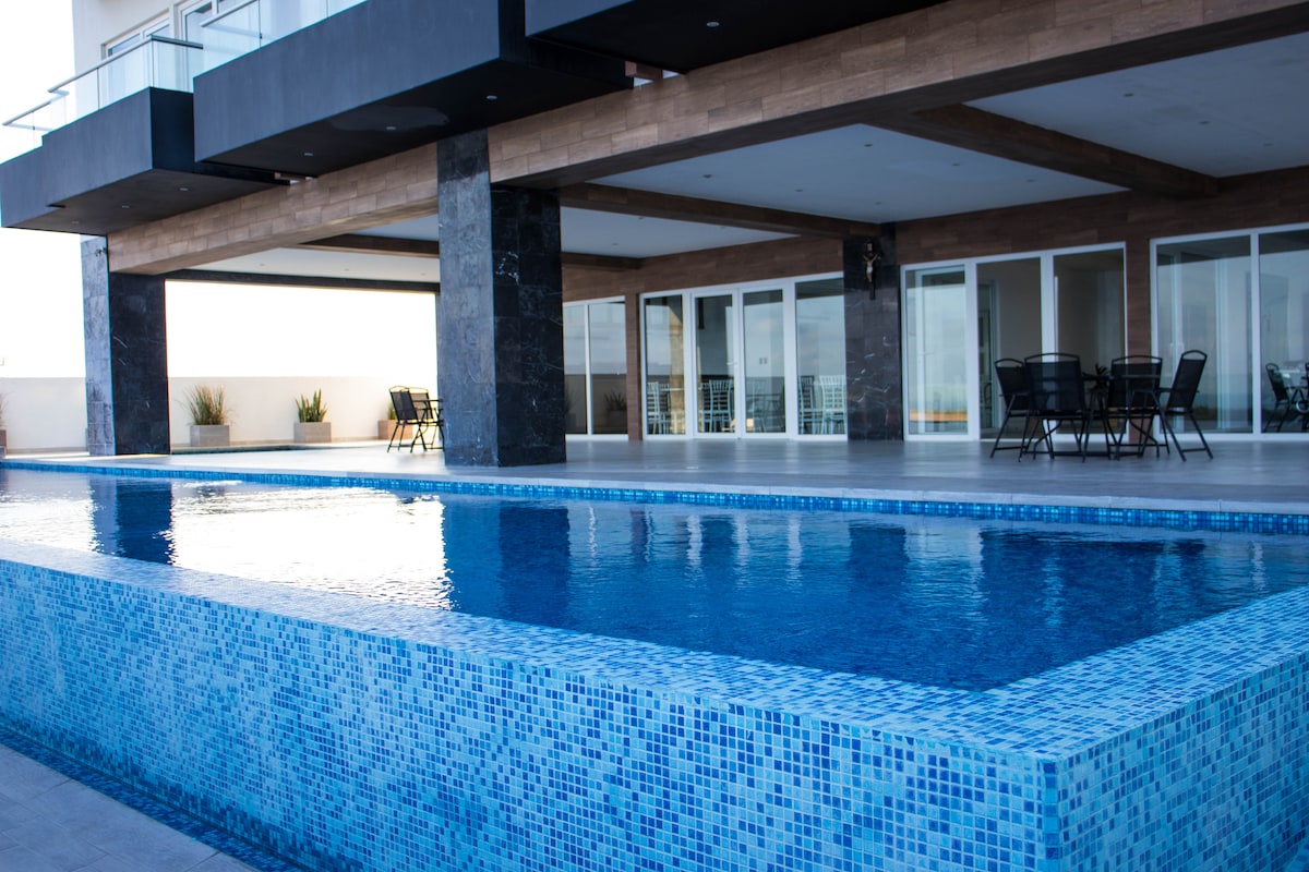Spacious Apartment with Tapanco, air-conditioned rooms surrounded by tourist attractions, shopping plazas, 5 minutes from the historic center, 2 minutes from beaches 1 km from the Veracruz Aquarium. -Room with smart TV and tapanco with rest network for adults and children. -Modern dining room and kitchen. -Master bedroom with king size bed, bathroom, closet and smart TV. -Secondary bedroom with double bunk bed and a single bed and closet. -Garage for one car with electric gate.