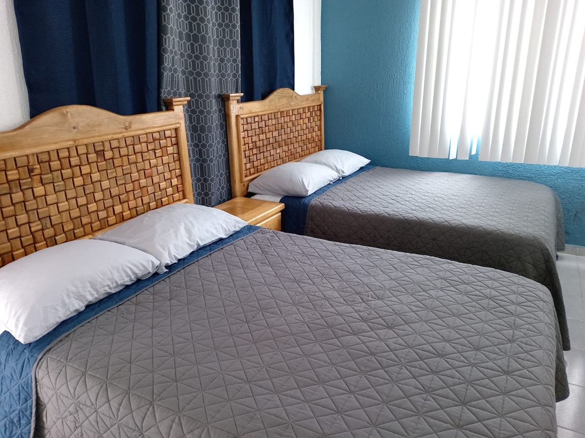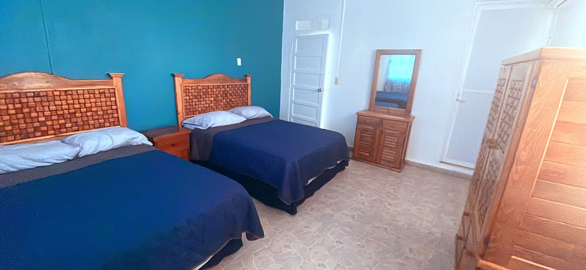 Habitación independiente situada en el tercer piso. Está habitación cuenta con un ventanal fijo que no se abre del otro lado es una habitación inhabilitada del otro lado . Esta habitación es nueva y se habilita en temporadas altas. Tiene una cama matrimonial, mini split, agua caliente , wifi y pantalla de 50 pulgadas . No cuenta con cocina. Contamos con 3 cajones para autos ( no caben pick up). Y es libre para todos los huéspedes. El estacionamiento es insuficiente para épocas de temporada .