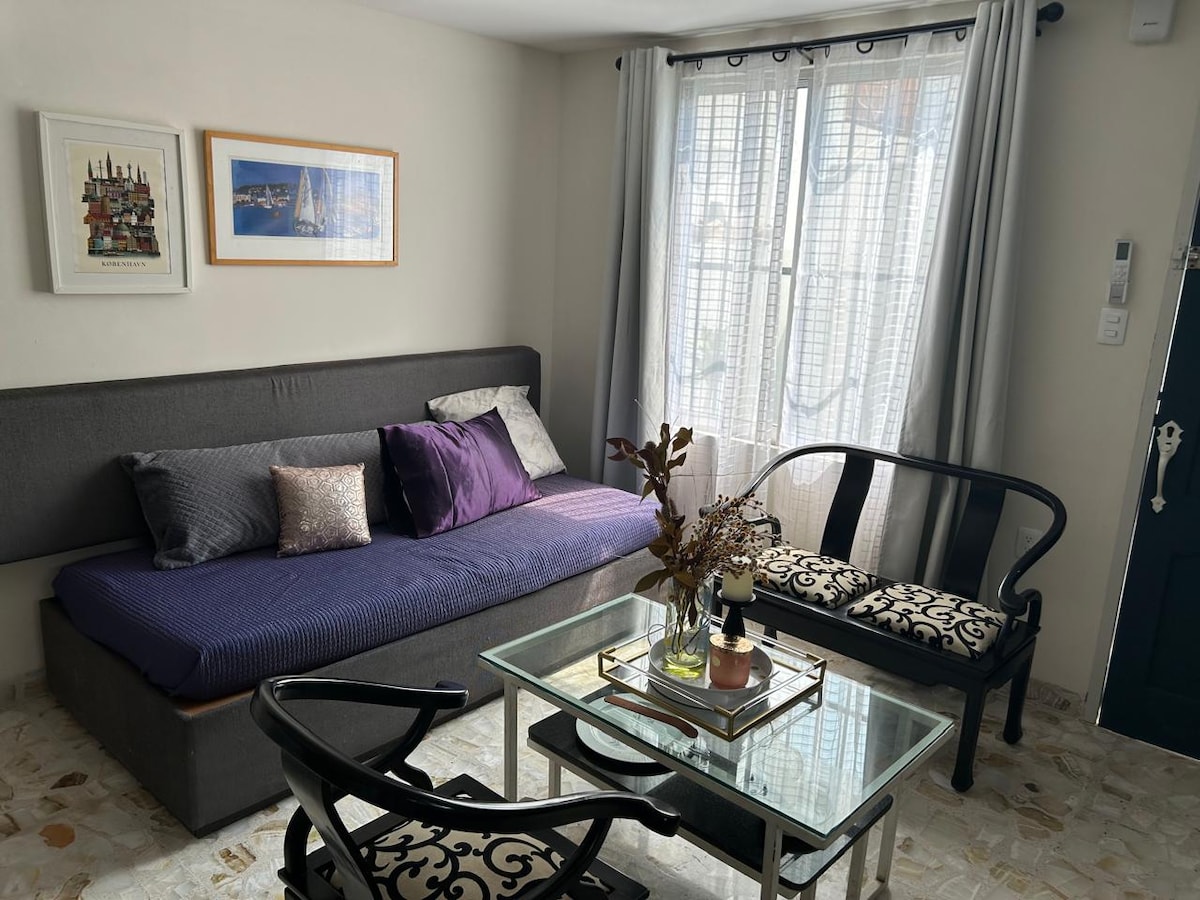 Tiene una ubicación estratégica! Acceso fácil a transporte público y con parking privado, donde auto y huéspedes están seguros. Está a 2 minutos de Plaza Cristal: Chedraui, cafeterías para degustar un rico café, restaurantes comida rápida, bancos, y más. Oxxo en la esquina. En su interior encontrarás una confortable sala de estar, desayunador, cocineta, baño, recámara con a/c y patio de servicio, así como área de trabajo. Excelente para una visita de placer o de trabajo, rápida o prolongada.