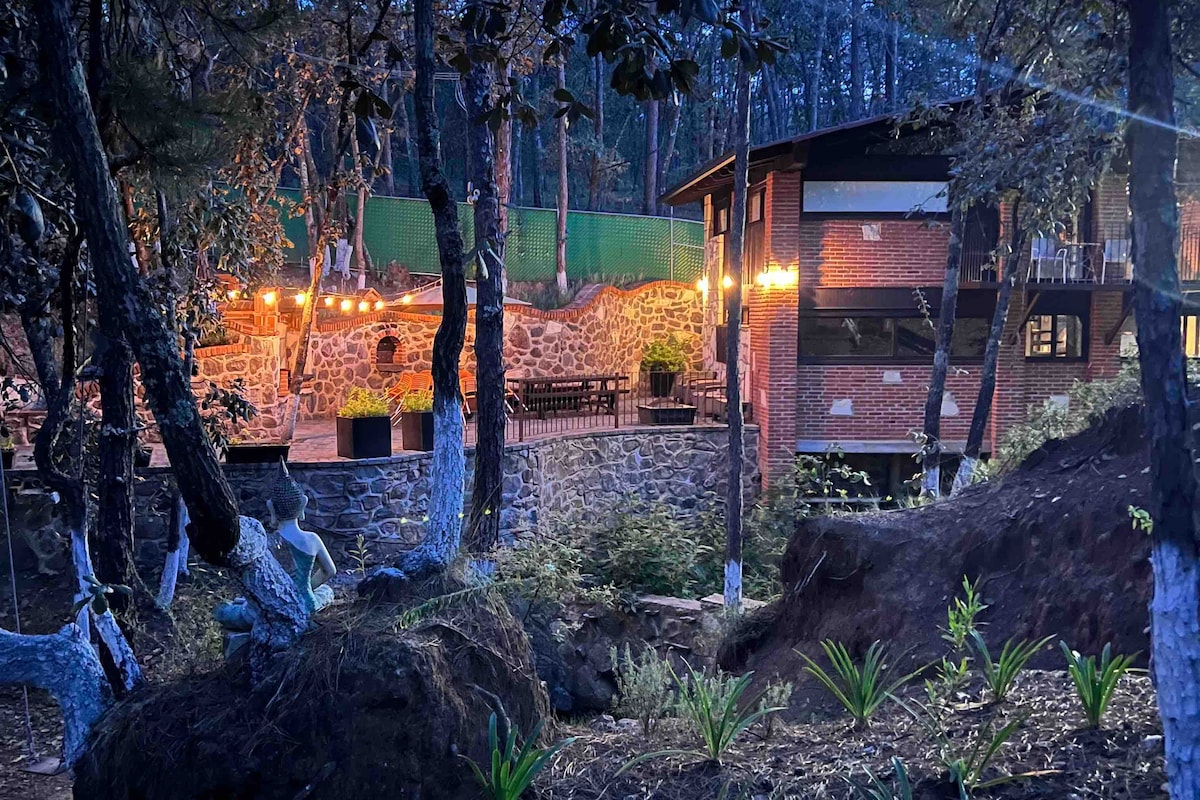 Romántico Chalet Oasis, tiene un diseño moderno y distinguido diseño. Se encuentra en un hermoso bosque donde es una delicia disfrutar de la tranquilidad, escuchando las aves y viento de los árboles. Podrás realizar caminatas en los alrededores y tomar un delicioso baño en la tina con vista al cielo. Disfruta de la vista del bosque en la terraza. Nos encargamos de dar el mejor servicio proporcionando lo indispensable para una estancia cómoda y relajante.