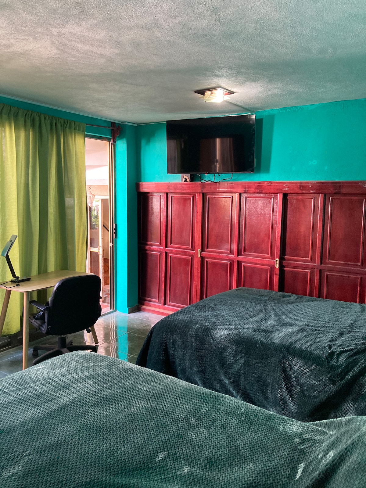 Habitación doble independiente de casa con vista a la naturaleza que te hace sentir como en la jungla pero a la vez con la acogedora privacidad, para trabajar y descansar. La habitación principal es de aproximadamente 3x4 metros con cama matrimonial y la otra habitación con cama individual mide aproximadamente 2.5 m x 3m donde también esta un baño completo para uso personal.