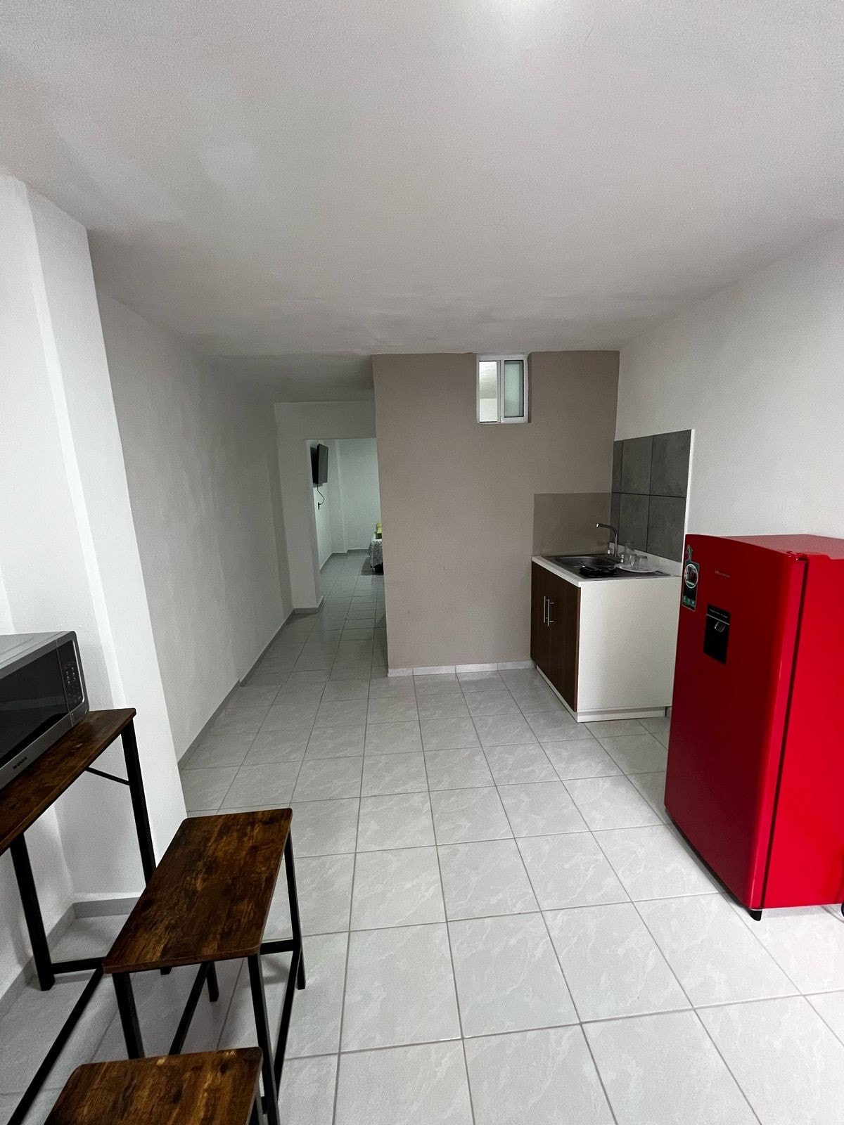 Pequeño departamento con sala y televisión, barra para tomar alimentos, cocineta con parrilla de inducción y servibar, baño completo y litera con cama matrimonial abajo e individual arriba además de otra cama individual. Entrada autónoma mediante video de instrucción.