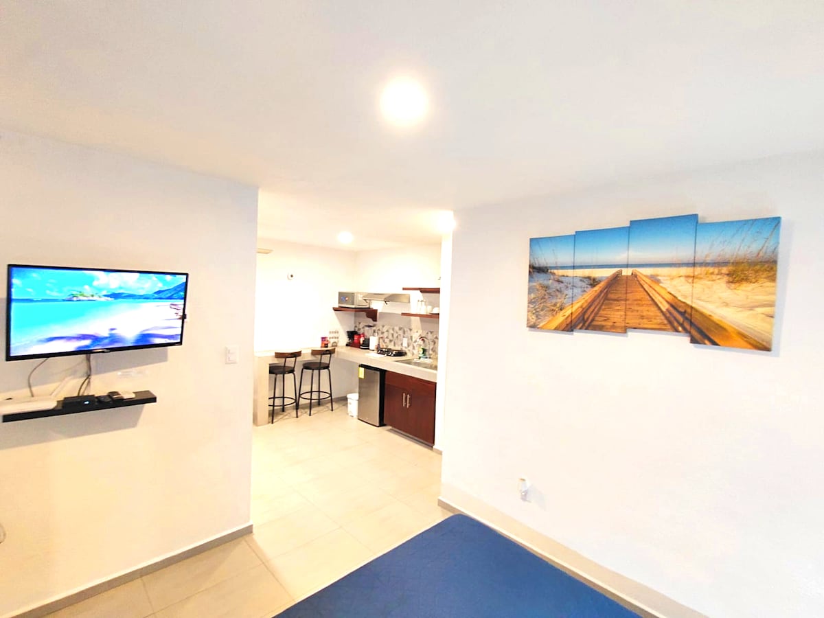 Bonito departamento, recien remodelado. Ven a estrenarlo. El espacio es todo para ti. Cuenta con cama matrimonial, aire condicionado, cocina completa con refrigerador, microondas y estufa. Vajilla, trastes, sartenes. Baño completo con agua fria/caliente. Salita con sillon de dos plazas, comedor y dos sillas con mesa amplia. SmartTV con Disney+, Netflix, STAR+, Crunchyroll y mas. Internet por fibra optica dedicado. Entrada a nivel de banqueta. En la orilla del Centro de Veracruz.