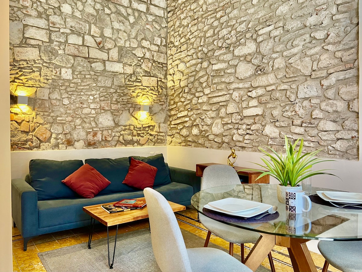 Well equipped lodge within historic distric, fully furnished, private parking with remote controled gate for vehicles up to 18 ft long and 7 ft high. Wi-Fi, smart TV on living room and main bedroom, one couch convertible into bed, air conditioned mini split type in all spaces, two balconies facing to the street, safe box, full kitchen, master berdroom with full size bed and secondary bedroom with two twin beds, hot water, self check-in equipped and all facilities to have a pleasant stay