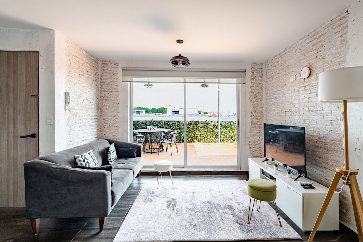 Relájate y disfruta en este cómodo lugar de lujo a la orilla del río . El edificio cuenta con: • Alberca, ¡trae tu toalla! • Terraza • Elevador • Un lugar de estacionamiento El depa cuenta con: • Aire acondicionado en ambas habitaciones y sala comedor • Smart TV • WiFi • Cocina equipada • Cortinas Black out Además: • Limpiezas disponible durante tu estadía con costo extra. • Aceptamos un máximo de 2 mascotas talla chica con costo • Facturamos ¡Te esperamos!