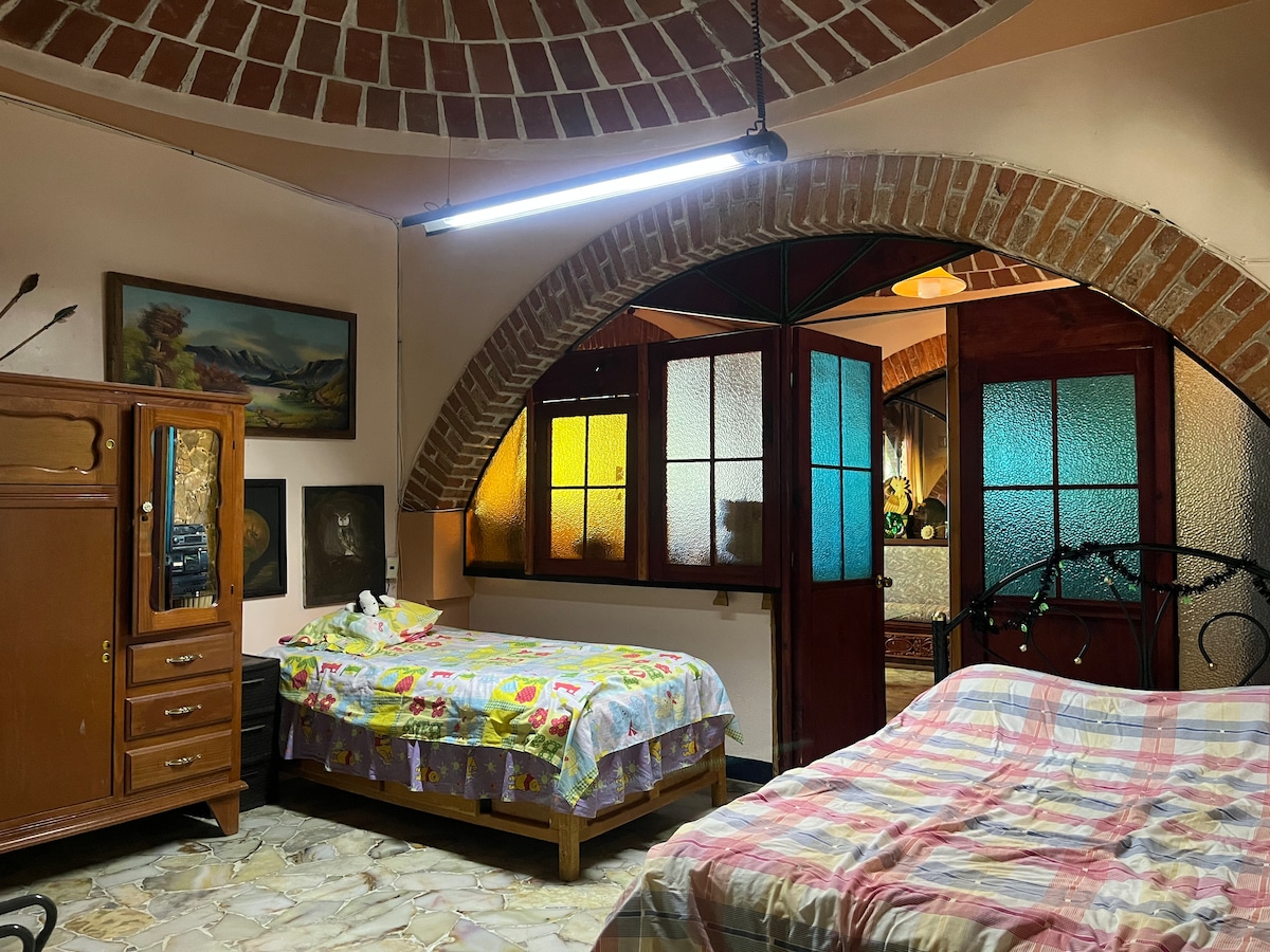 Acogedora recamara dentro de una hacienda pulquera . Cuenta con una cama matrimonial y baño completo privado. Dentro de la casa podrás compartir con otros huéspedes la sala con chimenea, comedor, cocina, terraza, oficina (wifi), mesa de ping pong, y jardines . Un delicioso desayuno está incluido en el pago de la noche. Podrás conocer los corrales, la parte más antigua de la hacienda del S. XVI, visitar la granja, visitar la Iglesia y una explicación del proceso de la elaboración del Pulque.