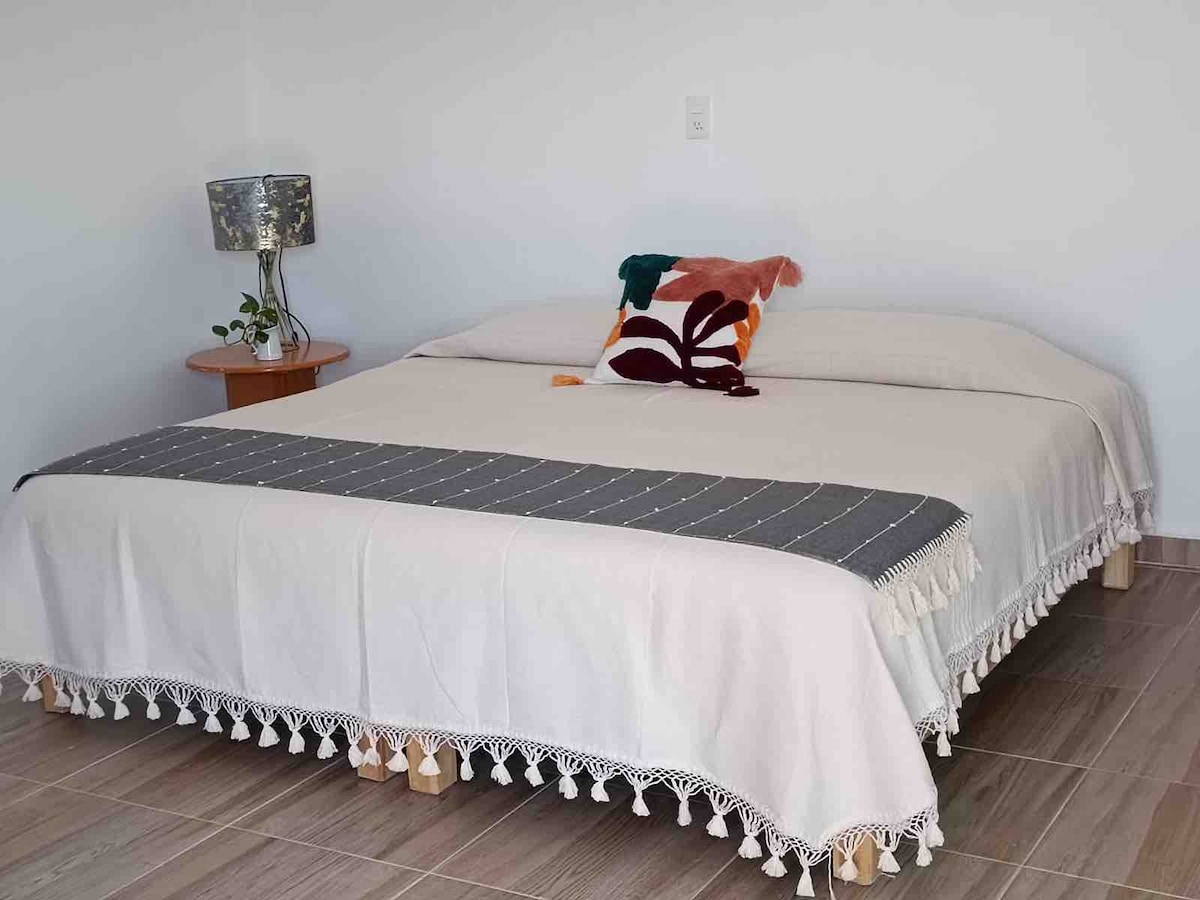 -- Amplia recámara muy iluminada y fresca. - closet. -Un sillón individual con mesa. -Dispone de wifi y tv por cable. -Baño con agua caliente. -Tiene una sala, comedor y cocineta. - Con una cortesía de agua y café. -En estancia de un día se entregará limpio el alojamiento. -estancias largas, para la limpieza se le proporcionará lo necesario para realizarla a su gusto y se ofrece un cambio de gratuito (toallas y sábanas ). Seguridad e higiene.