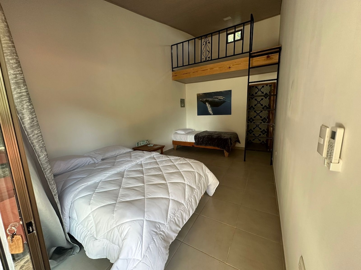 At Beachfront Nature Rentals, we have a Private Studio Suite on the ground level of our guesthouse with STARLINK WIFI. Backup power generator. Top quality queen size bed. It's perfect for relaxing, enjoying the sounds of the jungle and ocean without neighbours, roosters, barking dogs or traffic. Only a few steps away from our 1 Km sandy beach. Next to Surfing Beach. Pool access all day long. For DIGITAL NOMADS, a desk, good wifi, work on the terrace, Rancho or beach.