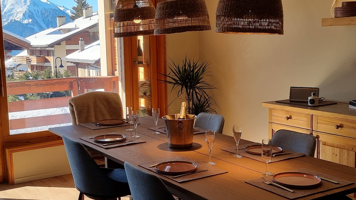 A spacious, quiet and charming 1 bedroom apartment that comfortably sleeps 2 but a third can sleep on the sofa bed in the lounge. We offer net flicks and a dvd collection. Surrounded by nature with fantastic views and only minutes from Verbier and Bruson ski lifts, bakery, Le Chable train station, Supermarket, restaurants and shops. Warm in winter and cool in summer. Storage for bikes and skis in the shared garage. June-October free ski lifts for walkers etc with the VIP PASS.