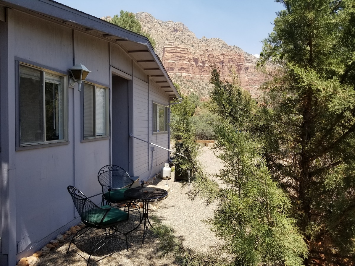 Quail Hollow casita is a "small house" that has everything you need! You'll be located in Jack's Canyon, which is a 5 minute ride to the Village of Oak Creek. A kitchen remodel with stainless & granite was completed in March of 2021. The back of the house features a rear deck with pergola and walk down stairs to a patio with fire table and zero gravity chairs. We recently updated our internet to high speed Starlink - no limitations on streaming or Zoom calls!