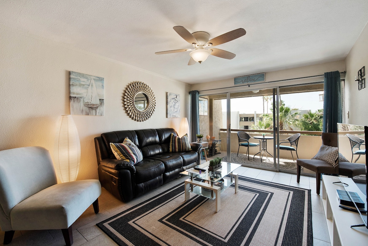 location....Location......Location. Recently remodeled condo directly across the street from everything including; shopping, entertainment, and restaurants. Condo is located front and center, top floor overlooking the pool. End unit, very private. Enjoy sunrise, sunsets, and palm tree's as well as pool viewings from balcony. View of mountains from front, picture of pool is taken from balcony. Walking distance to Giants stadium, fashion square mall and anything you desire. license # 2034786