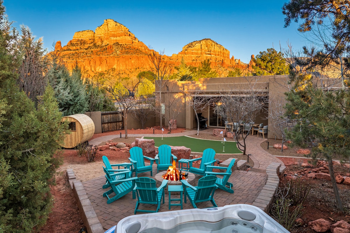 Welcome to The Boho, a Sedona retreat with all the amenities! Enjoy a 4 bedroom 2 bath house complete with an 8-person sauna, yoga studio, pool table and secret room (have fun finding it!) Nestled in a quiet neighborhood with peaking views of the red rocks, you can dine outside on the patio or inside, relax in the grand room for a late night movie or pool game. You are minutes from hiking trails, coffee shops, restaurants and more. Whatever your getaway needs, this house is here to help!