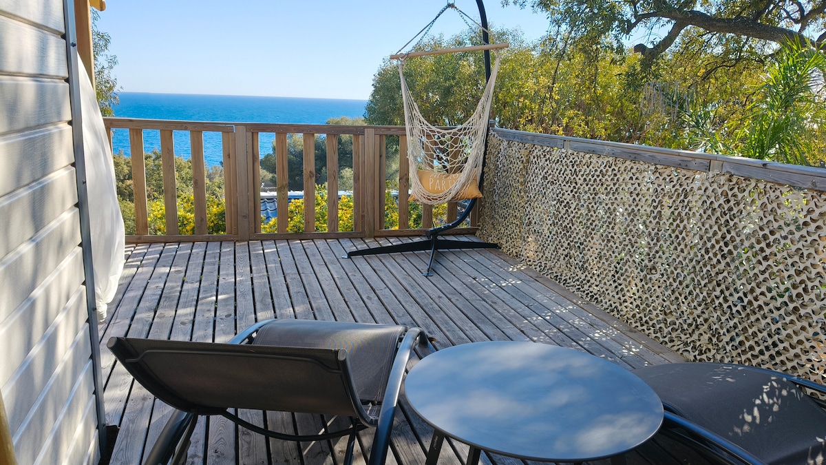 In this superb Lodge, you will enjoy a dream location open to nature with 2 magnificent wooden terraces with a breathtaking view of the sea!! With 2 large windows of 2.50m, you will love the tranquillity of this paradise within the campsite domaine 4**** de l'ile d'or. Two bedrooms (1 bed 140/200 and 3 beds 90/200), a bathroom with XXL walk-in shower, a separate toilet, an equipped kitchen/air-conditioned living room open to the outside, you will no longer leave..!
