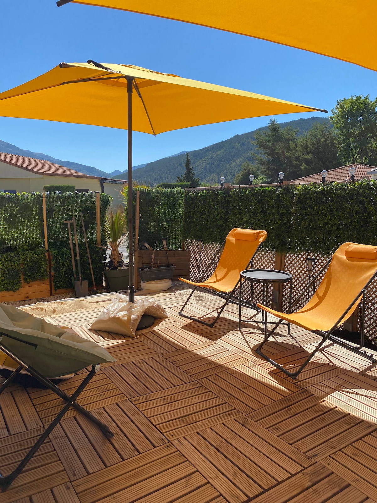 Vous adorerez cette escapade unique et romantique. Chalet de 20m2 avec jardin privatif et parking, chauffage et climatisation réversible, sol chauffant . Canapé Lit 2 places de taille standard 140cm type clic clac très confortable matelas epais+1 fauteuil qui se déplie en lit d'appoint une place pour un enfant ou adulte occasionnel. Salle de bain et toilettes séparés, cuisine équipée, TV, wifi, Ok Googl climatisation, ventilateur... Proche de toutes les commodités !