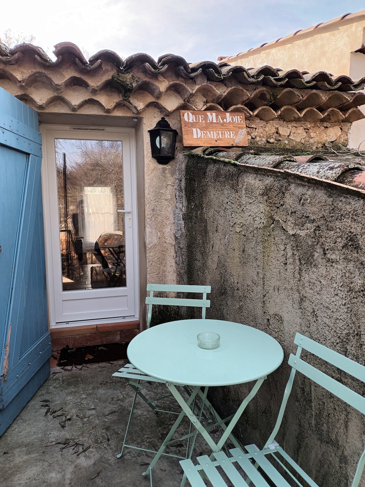 Joli studio nommé "Que ma Joie demeure" situé dans une ferme au milieu des chevaux et animaux à 2 km du village de Ginasservis. Studio meublé de 35m2 décoré avec soin. Idéal pour 2 personnes...il comprend un grand lit+un canapé. Petite cuisine équipée avec petit four, plaques de cuisson, micro ondes,frigo...(machine à café, bouilloire et grille pain) Draps de lit et serviettes bains fournis Non fournis:savon,shampoing Équipé Wi-Fi Parking gratuit sur place