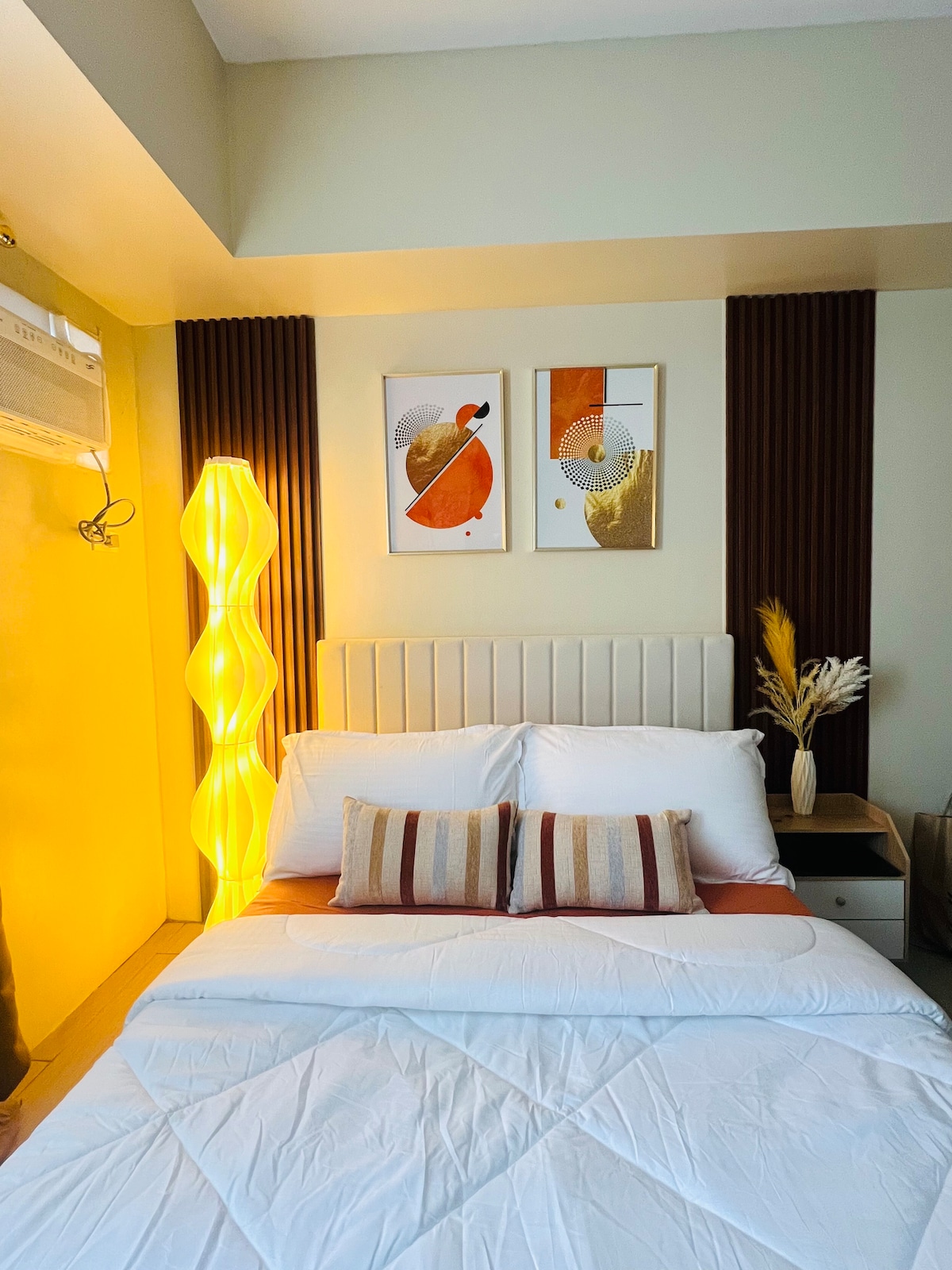 - Across SM City Mall (cinema, supermarket, dept. store, cafes, Anytime Fitness) - 2 Bedrooms with Patios, lush view. - 1 Queen Bed, 1 Full Bed - Up to 1 Extra Mattresses available upon request (Advance Notice pls) - Free Swim Pool Access for 4 Persons (P200/person for excess) (Advance Notice pls) (Pool not available on Mondays) - Pay Parking Available (P200/night. Advance Notice please) - Broadband Wifi - Kitchen - Washing Machine - Self-Check in - Check in: 3PM - Check out: 11AM