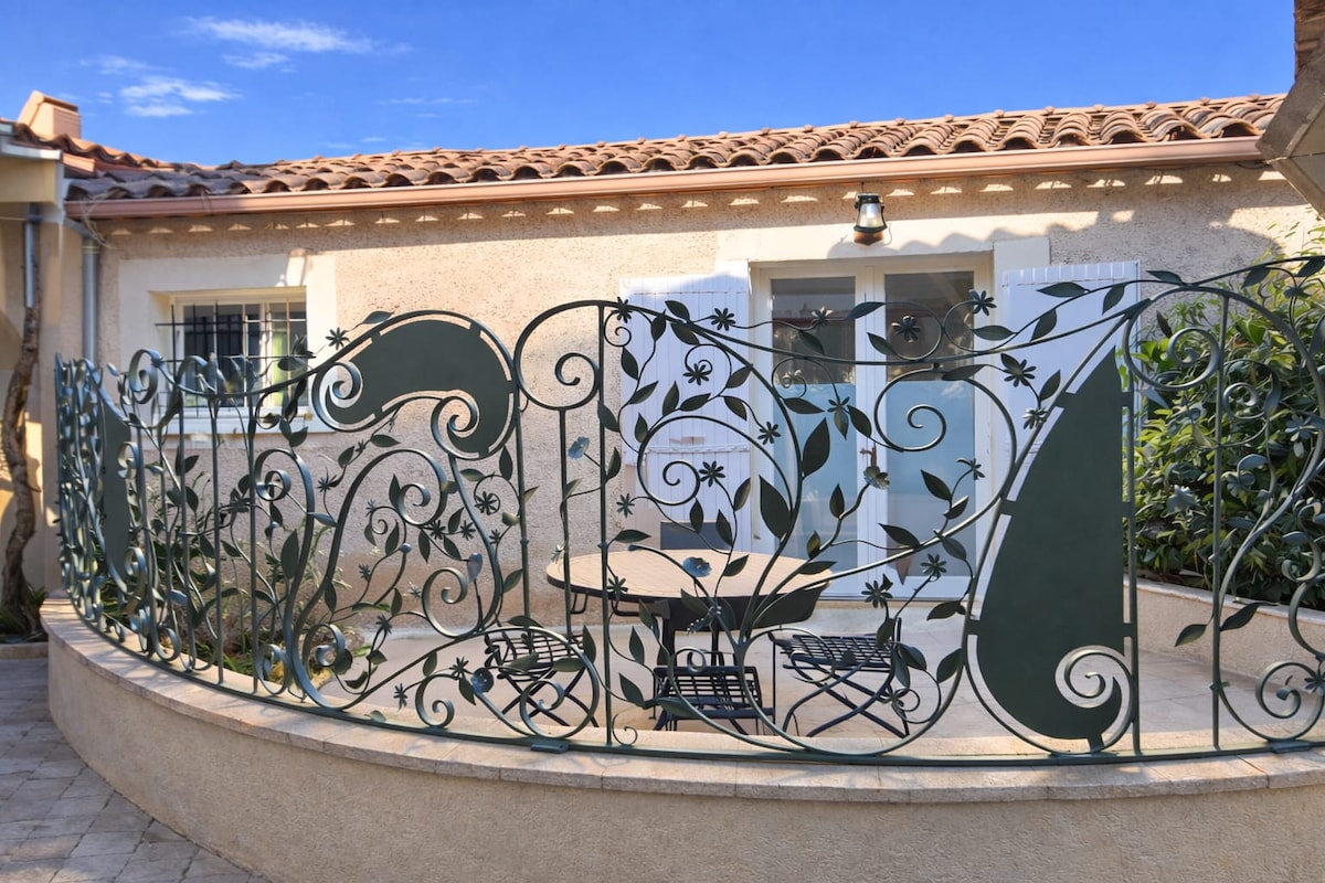 Ce gîte contemporain de 140 m2 est équipé(WIFI) climatisé pour 4. Grande salle à manger et cuisine avec plaques, four , frigo américain, lave-linge, lave-vaisselle, Nespresso, micro ondes, grille pain et bouilloire. 1 chambre avec lit en 160 et une sdb avec baignoire îlot. Un salon avec convertible en 140 de très bonne qualité avec une tropézienne. 2eme chambre avec lit en 180 et gde sdb avec douche à l'italienne. Entrée privée et parking gratuit.