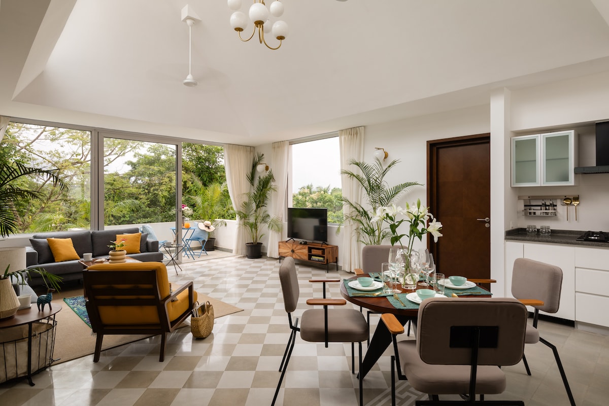 La Ruhe (by @pinkpapayastays) is a modern apartment with a private deck, located in a quiet neighbourhood. It's a 15 minute drive from Panjim and a 10 minute drive from the bustling Candolim. The private patio will give you ample opportunity to enjoy the palms whilst sipping tea or even some wine!