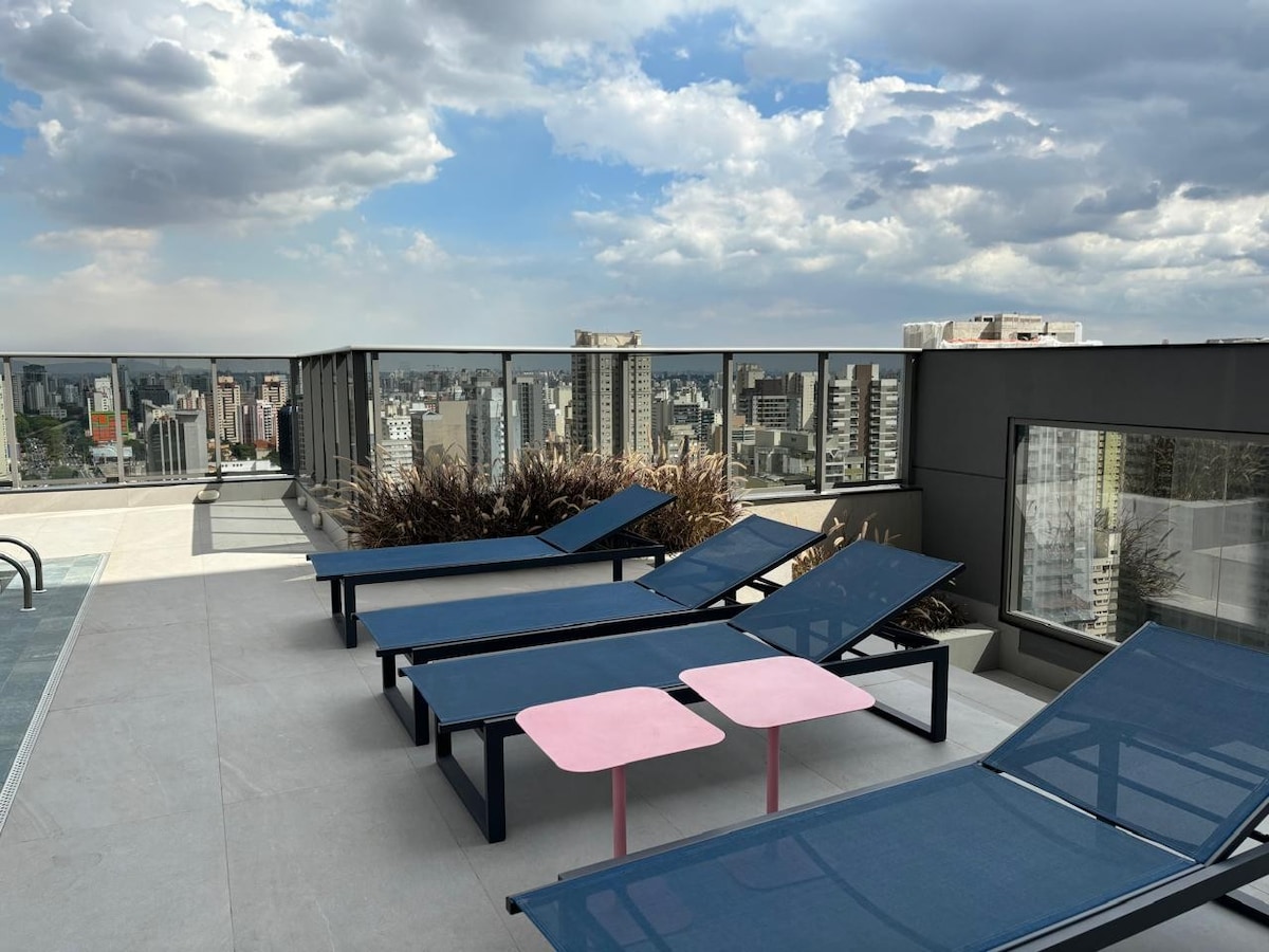 Estúdio espaçoso com muito design, arquitetura e a melhor vista de São Paulo. Loft completo! Com cama queen, closet, ar condicionado silencioso, cozinha completa, home office, WI-FI, TV 55” e uma belíssima banheira de imersão, de onde pode apreciar o seu drink preferido e curtir uma vista apaixonante. São Paulo toda estará há poucos minutos de você. Acesse o metrô andando apenas 200m. Reserve com tranquilidade! Proporcionaremos uma excelente hospedagem e uma ótima experiência!