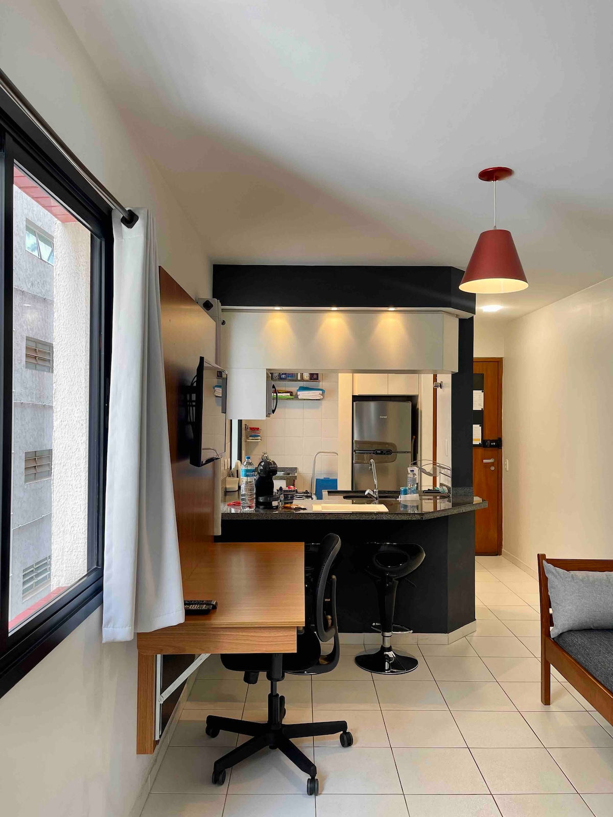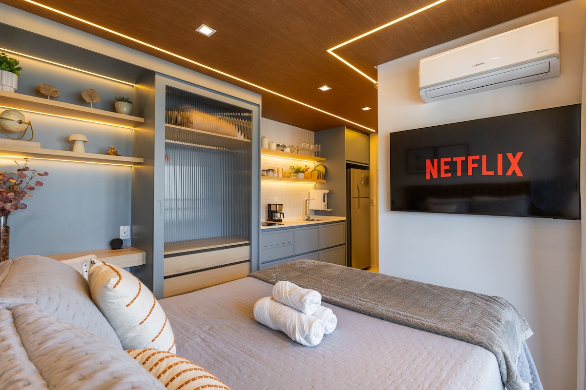 Studio com decoração moderna. Localizado nos Jardins a poucos passos da Av. Paulista e da estação metrô Trianon-Masp. Próximo a shoppings, restaurantes, supermercados e com rápido acesso ao Aeroporto de Congonhas.