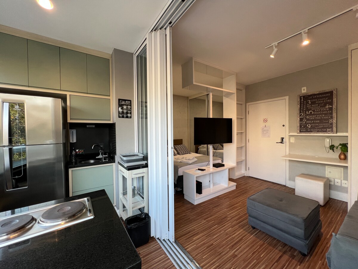 Apto moderno (Studio de 30 m²), planejado e decorado com muito carinho para você se sentir em casa e se apaixonar por SP. A varanda possui uma linda vista para a avenida 23 de Maio (andar alto). Prédio com excelente localização que propicia fácil deslocamento.