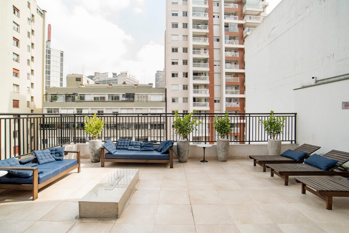 Apartamento completo com ar-condicionado no quarto, TV, cozinha compacta e varanda com vista incrível de São Paulo. Wi-Fi gratuito e limpeza diária. Prédio com recepção 24h, piscina, sauna, academia e jacuzzi coletiva. Estacionamento e café da manhã pagos à parte, servidos no restaurante do térreo. A uma quadra da Paulista, atrás do MASP, perto de tudo!