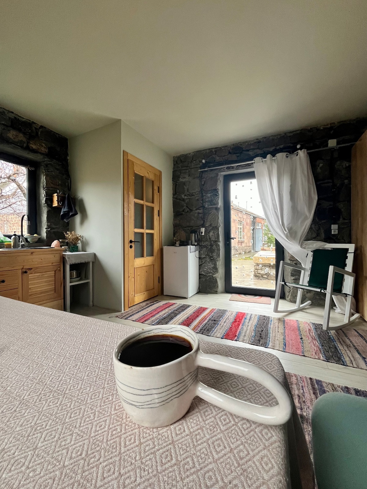 Comfortable studio with everything needed to live, rest or work. Studio is situated near the city center, only 15 minutes walking distance to the main center of Yerevan. 3rd floor of the house, with a terrace and wonderful view to the city. Though it’s central place, you can enjoy your time in the green garden and smell fresh air, because the house is situated in the middle of many gardens. We planned the studio and equipped it with everything guests might need.